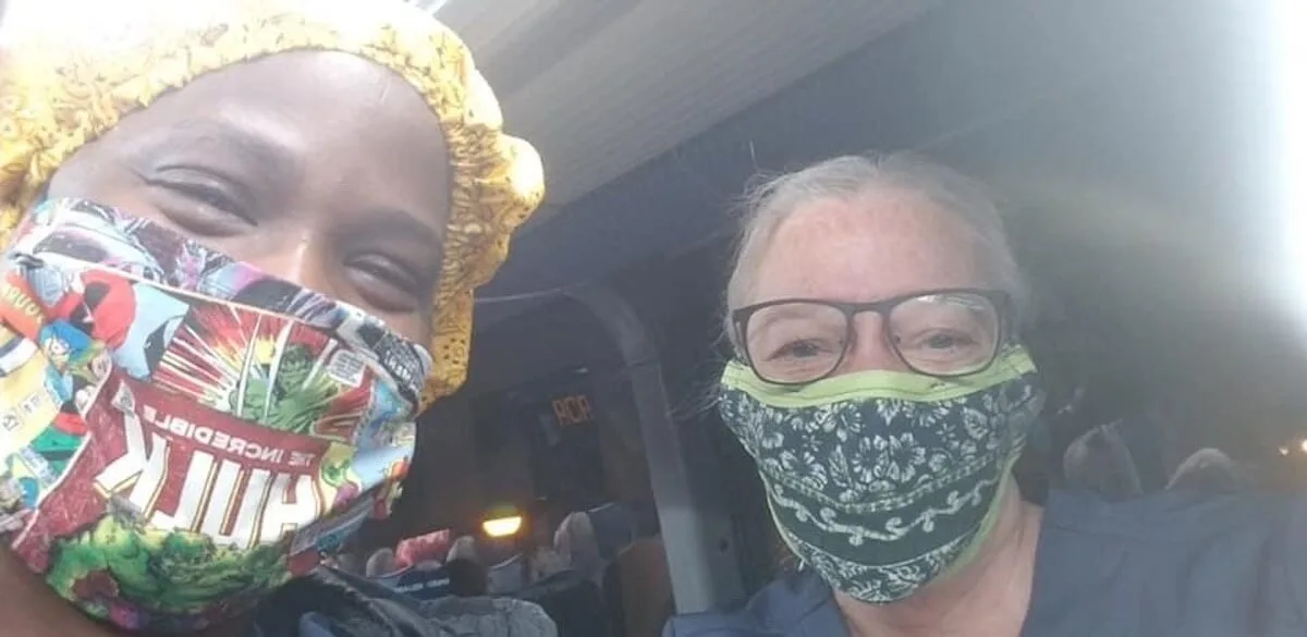 Buffy Riley, right, and one of the nurses she works with treating patients hospitalized with COVID-19 at Woodhull Medical and Mental Health Center in New York wear masks made by Eau Claire resident Deb Peterson and sent to Riley. Nurses at many New York hospitals said they lack enough masks and other personal protective equipment. (Photo by Buffy Riley)
