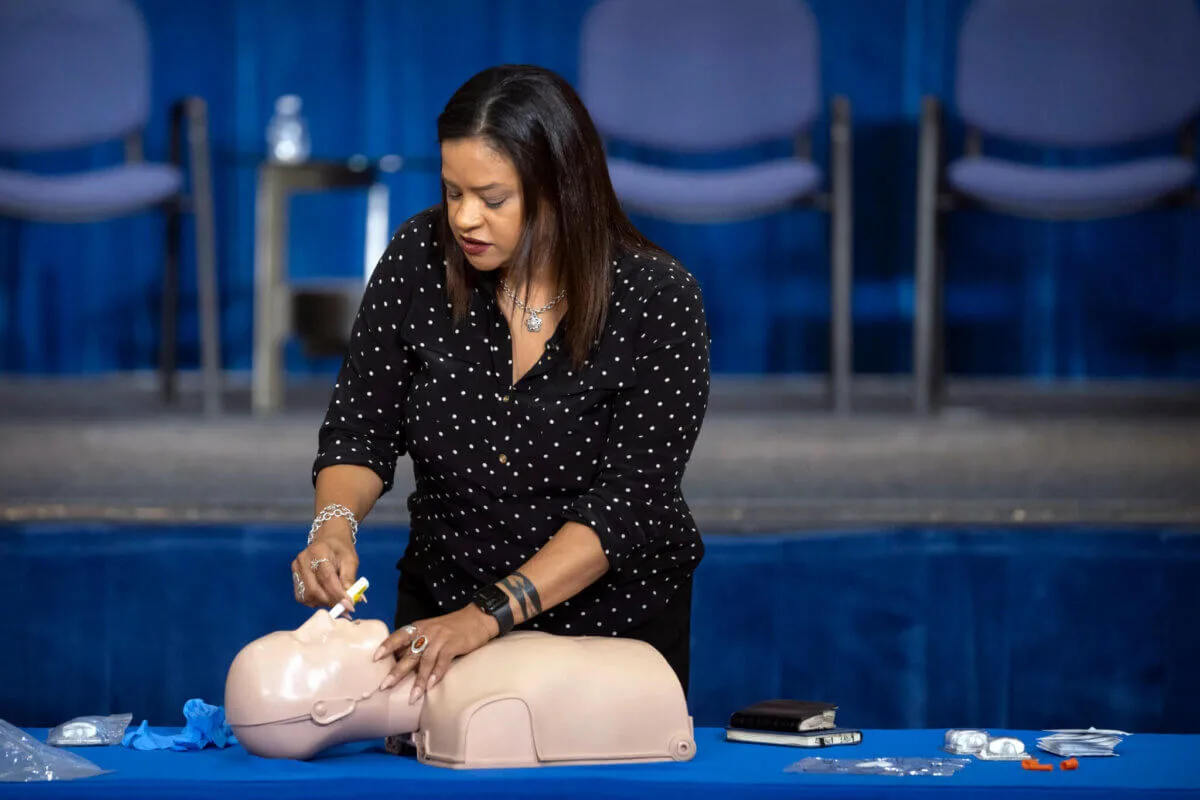 Rosalind Pichardo, the founder of the Philadelphia organization Operation Save Our City, demonstrates how to administer Narcan at the Health and Human Services Humphrey Building on Friday, Sept. 8, 2023, in Washington. Health officials held an event on Friday to mark the availability of the opioid overdose-reversal drug naloxone without a prescription. (AP Photo/Mark Schiefelbein)