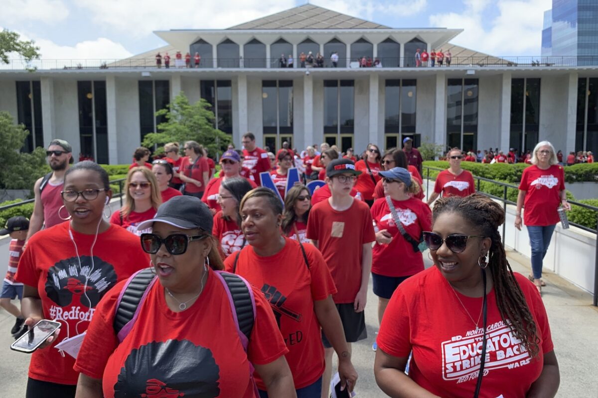 Teachers and their supporters marched on the state capitol in Raleigh, N.C., on Wednesday, May 1, 2019, to demand better funding in schools, increased salaries, the expansion of Medicaid, and better mental health services in schools, among other things. (AP Photo/Amanda Morris)