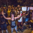 As the officer shouts, “Get the f— back!” many quickly thrust their hands in the air.