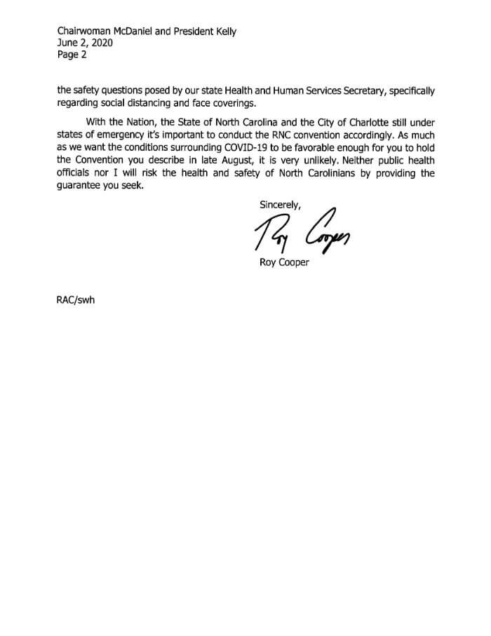 But Cooper rebuffed GOP demands Tuesday, writing that the state could at least discuss plans for a “scaled-down convention.”