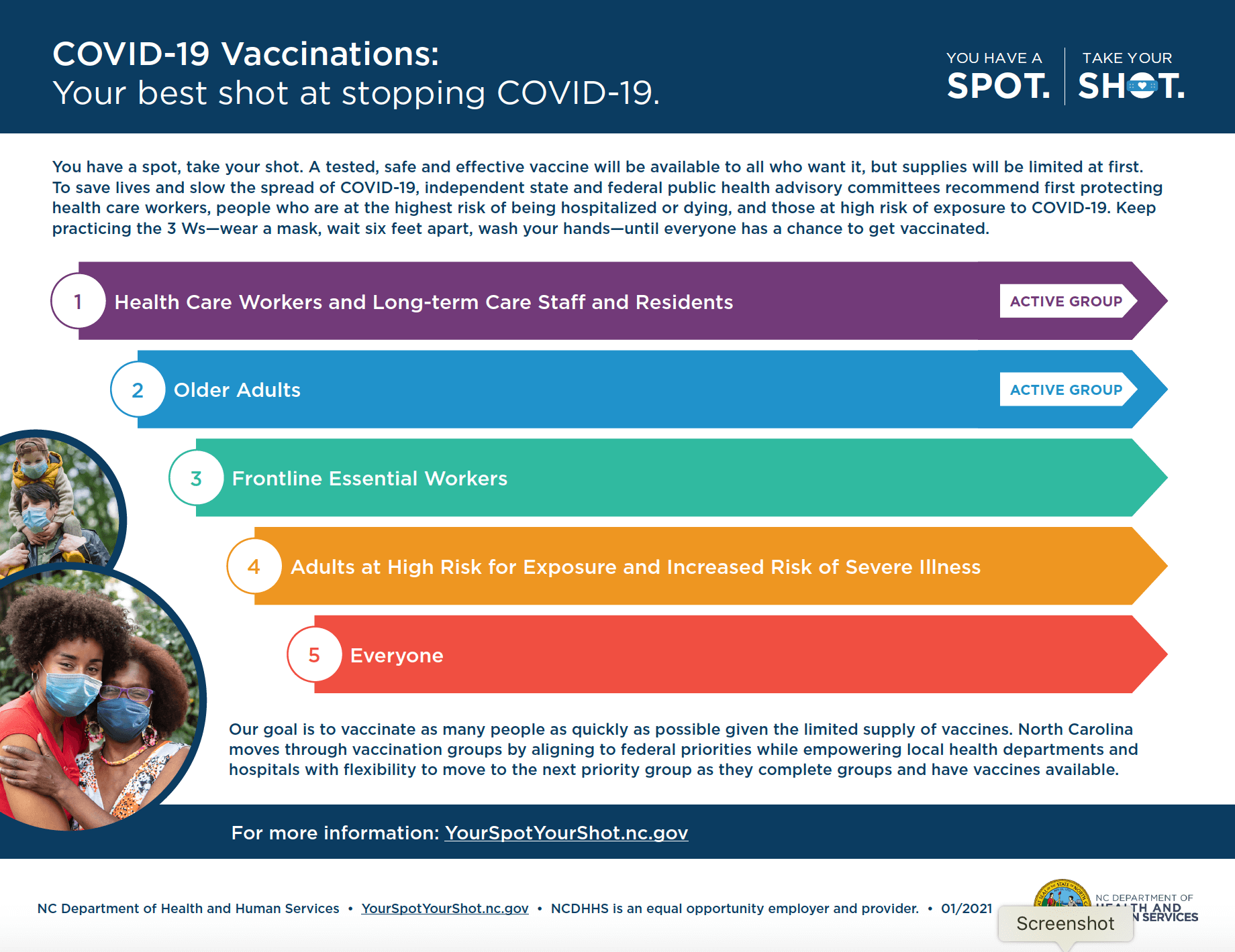 NC DHHS also released a video—“You Have a Spot, Take Your Shot”—showcasing several older North Carolinians , including many community leaders, talking about why they opted to get vaccinated.