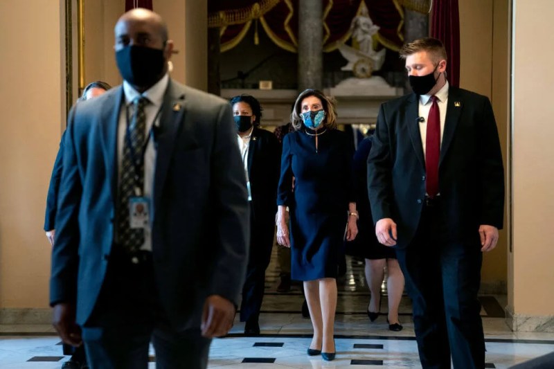 WASHINGTON, DC – JANUARY 13: Speaker of the House Nancy Pelosi (D-CA) (C) wears a protective mask while walking to the House Floor during a vote on the impeachment of President Donald Trump at the U.S. Capitol on January 13, 2021 in Washington, DC. The House of Representatives moved forward with impeachment following Vice President Mike Pences refusal to use the 25th amendment to remove Trump from office after protestors breached the U.S. Capitol last week. (Photo by Stefani Reynolds/Getty Images)