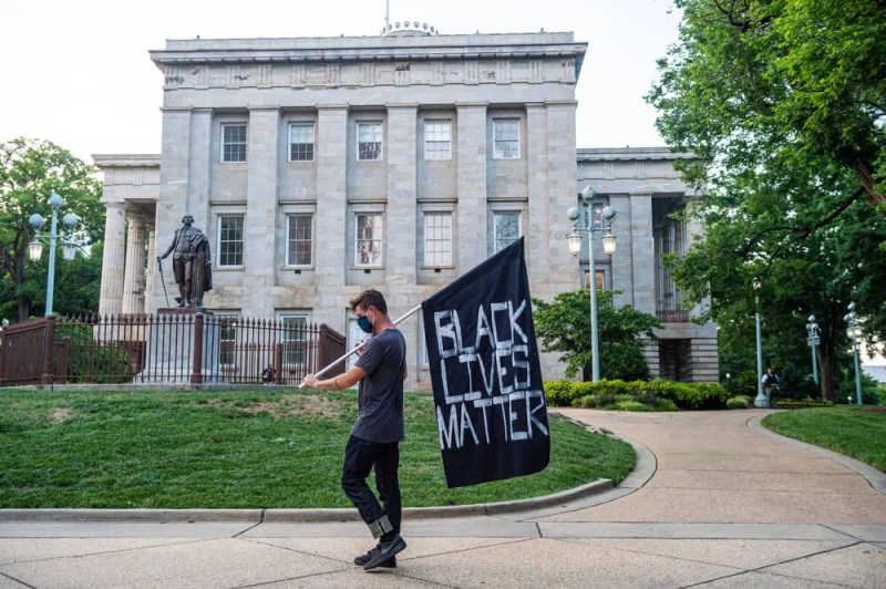 A demonstrator marches in front of the State Capitol in Raleigh in June. The Capitol has been the scene of multiple protests of racial inequality in 2020. (Image via Shutterstock)