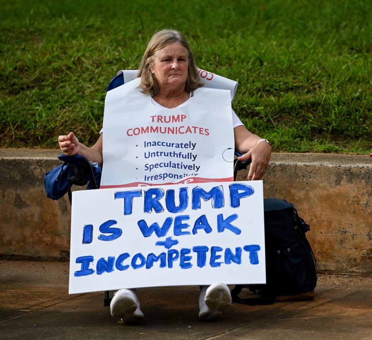 Around 75 people were in attendance, some waving signs that read “Liar in Chief,” “Veterans Against Treason” and “Take Your Knee Off Our Necks.” More than 26 activists representing advocacy groups for racial justice, housing security, voters rights and educational equity took turns on the microphone.