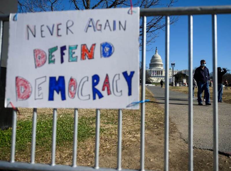 People pass signs of support near the US Capital in Washington, DC on January 10, 2021. – Donald Trump faced fresh calls Sunday from some members of his own party to resign over the violent incursion into the US Capitol, as the threat builds for a historic second impeachment effort in his final 10 days in the White House. (Photo by Andrew CABALLERO-REYNOLDS / AFP)