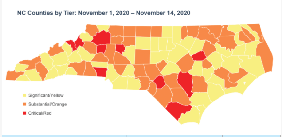 Cooper also revealed a new county COVID alert report that highlights those areas of the state that are seeing the worst of the virus, and said the NC Department of Health and Human Services would work with them to make additional suggestions for localized restrictions.