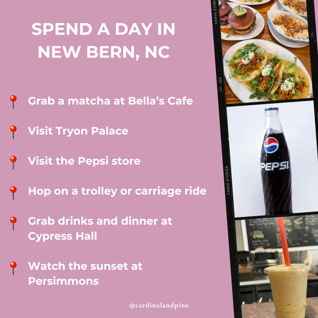 Check out our guide to a day in New Bern. Start with a chill matcha at Bella’s Cafe, wander through history at Tryon Palace, grab some Pepsi swag, cruise around on a trolley or carriage, hit up Cypress Hall for drinks and grub, and end the day with a sunset at Persimmons‘ waterfront restaurant.🍵