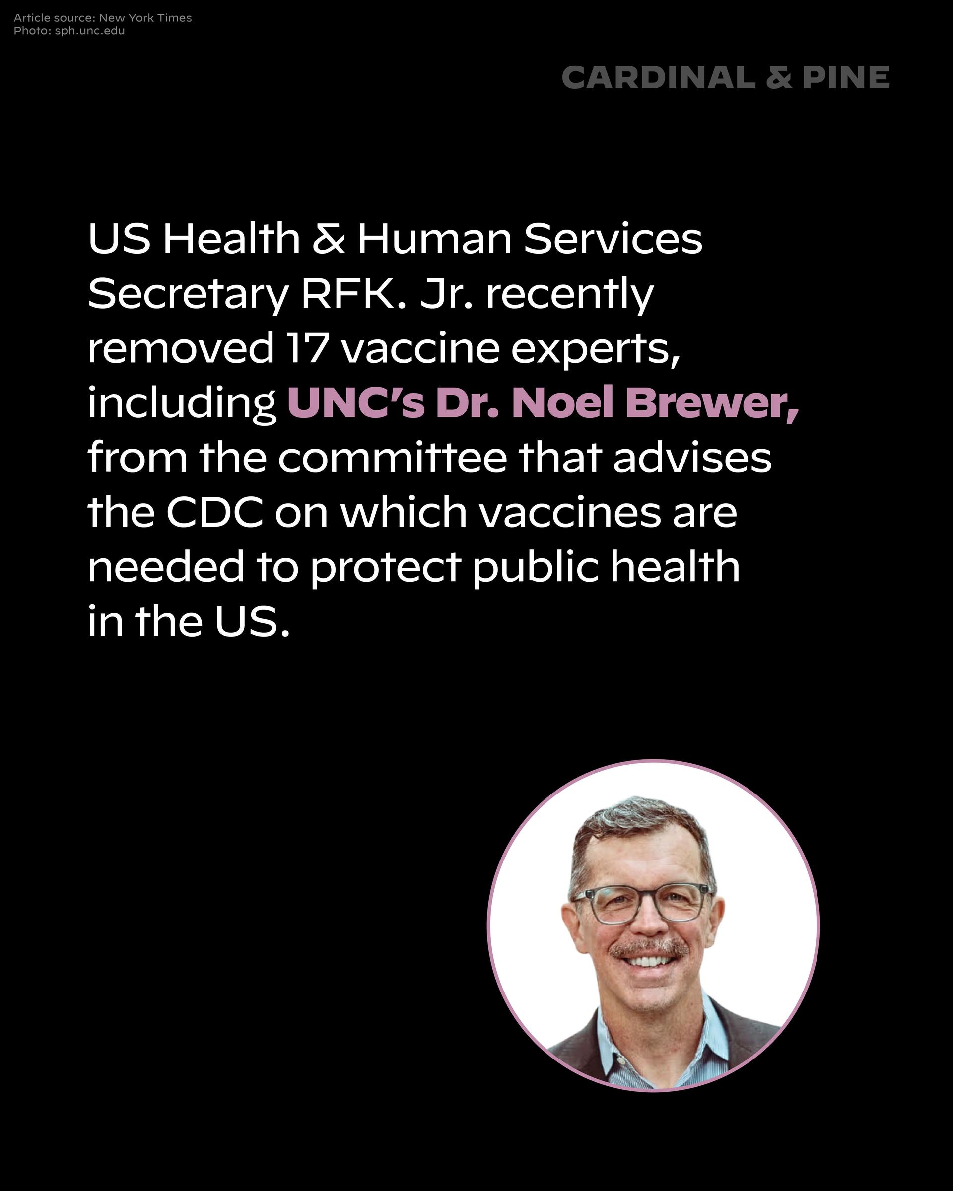 Recently, we learned that US Health & Human Services Secretary Robert F. Kennedy Jr. dropped 17 vaccine experts from the committee that advises Americans on which vaccines to take. They include Dr. Noel Brewer, a professor in public health at UNC-Chapel Hill.