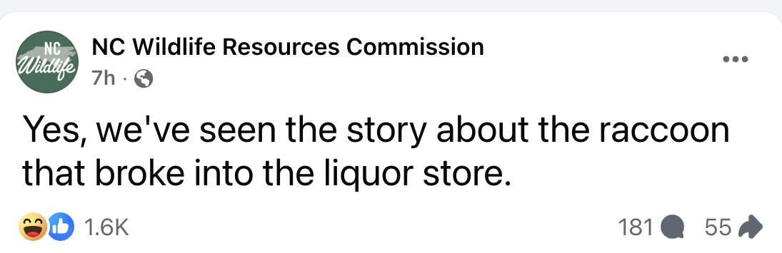 Yes, it’s true. A raccoon broke into an Ashland, Virginia, liquor store, got drunk, and then took a snooze. (See below.) 😂