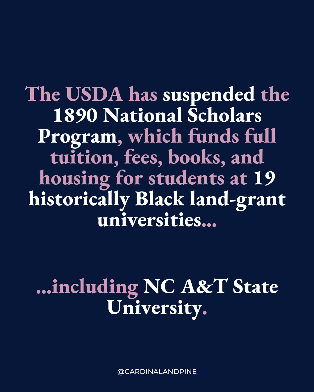 Cardinal & Pine’s Jessica F. Simmons reported this week on a recent decision by the U.S. Department of Agriculture to suspend the 1890 National Scholars Program, a scholarship that provides full tuition, fees, and housing for students at 19 historically Black land-grant universities, including NC A&T State University.