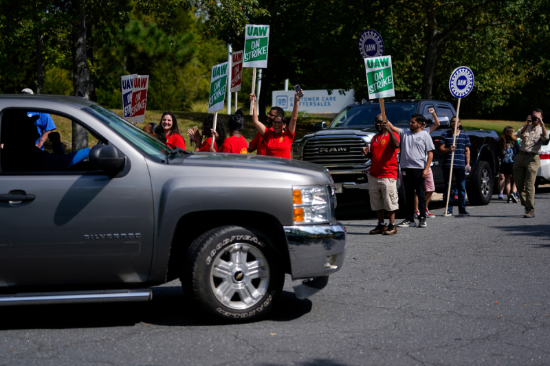 Supporters of the United Auto Workers local 2404 cheer as employees walk off the job in strike outside a General Motors facility in Charlotte in 2023. (AP Photo/Erik Verduzco)